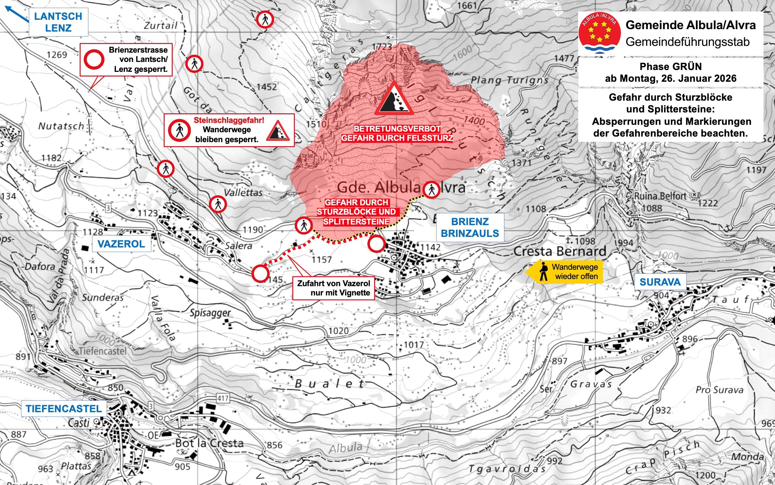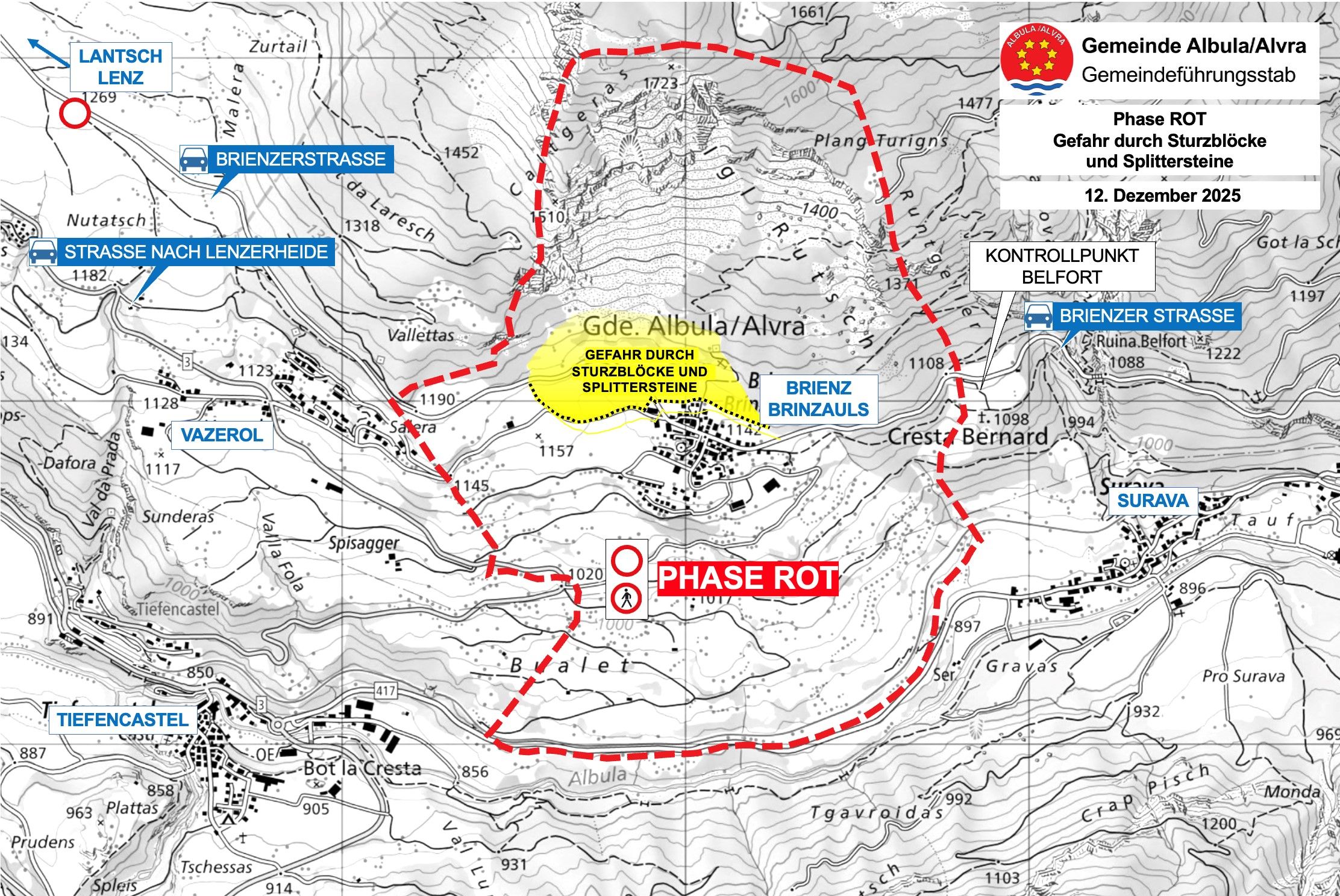 Die Gemeinde Albula/Alvra hat die neue Arbeitsgruppe Umsiedlung Brienz/Brinzauls eingesetzt. Sie hat die Aufgabe, eine teilweise oder gesamte Umsiedlung des Dorfes zu begleiten und dabei insbesondere die betroffenen Eigentümer:innen von Erst- und Zweitwohnungen zu beraten und zu unterstützen.